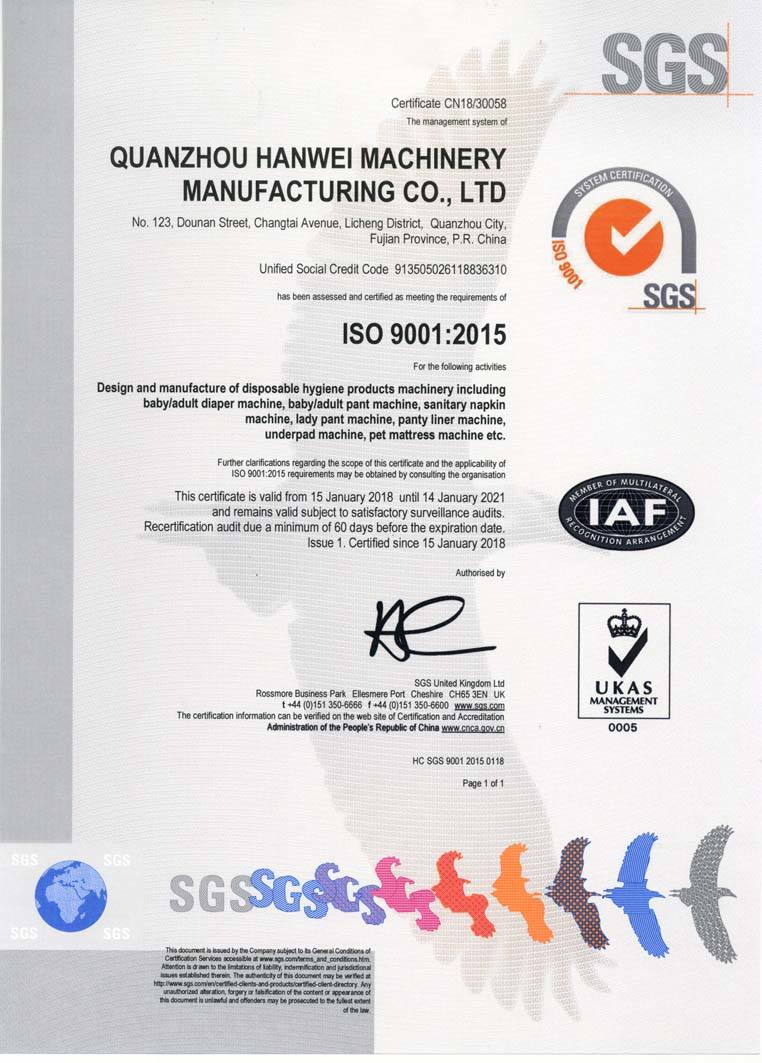 泉州市漢威機(jī)械制造有限公司是一家集生產(chǎn)、研發(fā)、銷售、服務(wù)為一體的高科技企業(yè)。一直秉承盡善盡美的思想,未來,泉州市漢威機(jī)械制造有限公司將在現(xiàn)有的基礎(chǔ)上,努力使“漢威制造”始終處于國際技術(shù)的水平,打造“百年漢威”。為實(shí)現(xiàn)這一目標(biāo),漢威公司務(wù)實(shí)創(chuàng)新,近日公司引進(jìn)ISO9001:2015質(zhì)量管理體系,通過對(duì)全體員工的宣傳、培訓(xùn),建立了一套符合國際標(biāo)準(zhǔn)要求的質(zhì)量管理體系,并嚴(yán)格按照質(zhì)量管理體系文件中的規(guī)定執(zhí)行、實(shí)施,在執(zhí)行過程中不斷的改進(jìn)和完善,使公司形成了一個(gè)系統(tǒng)、完善的管理體系,提高了全體員工的工作質(zhì)量和工作效率,進(jìn)一步保證了產(chǎn)品質(zhì)量、服務(wù)質(zhì)量和公司的管理質(zhì)量,為公司持續(xù)發(fā)展,不斷改進(jìn)和提升奠定了堅(jiān)實(shí)的基礎(chǔ)。審核專員在我司特派專員的陪同下,各個(gè)部門的全力配合下,對(duì)我司質(zhì)量管理體系進(jìn)行了細(xì)致嚴(yán)謹(jǐn)?shù)膶徍耍隙宋宜举|(zhì)量管理工作。后ISO9001:2015質(zhì)量管理體系認(rèn)證順利通過。于2018年1月15日獲得了ISO9001質(zhì)量管理體系認(rèn)證證書。